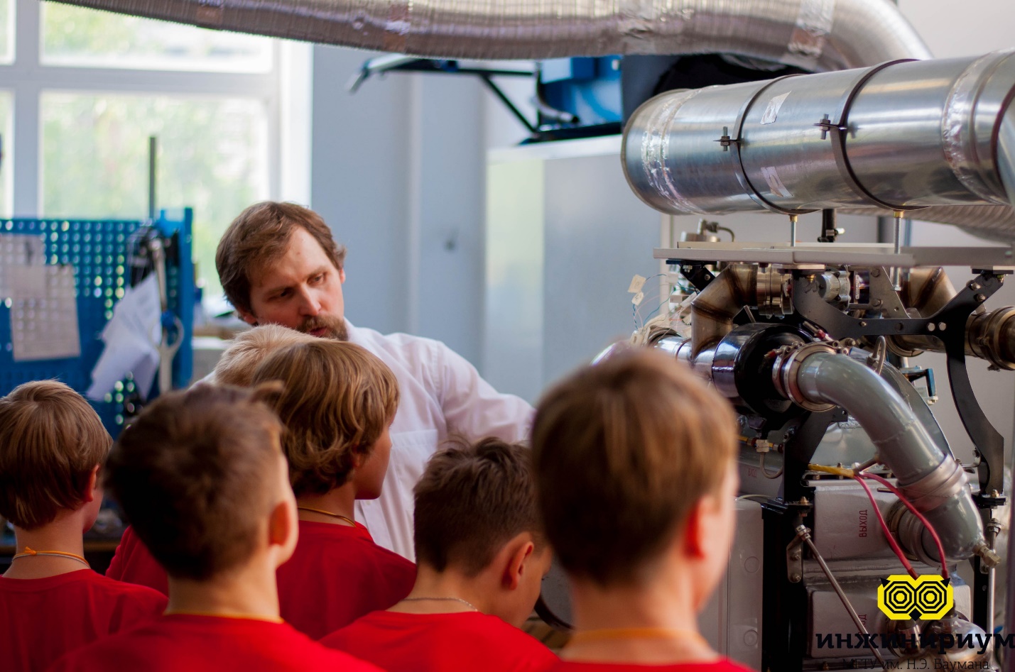 Знакомство с «сердцем» авиационной системы кондиционирования воздуха в лаборатории Э4 (на фотографии ребята из летнего лагеря «Инжинириум»).