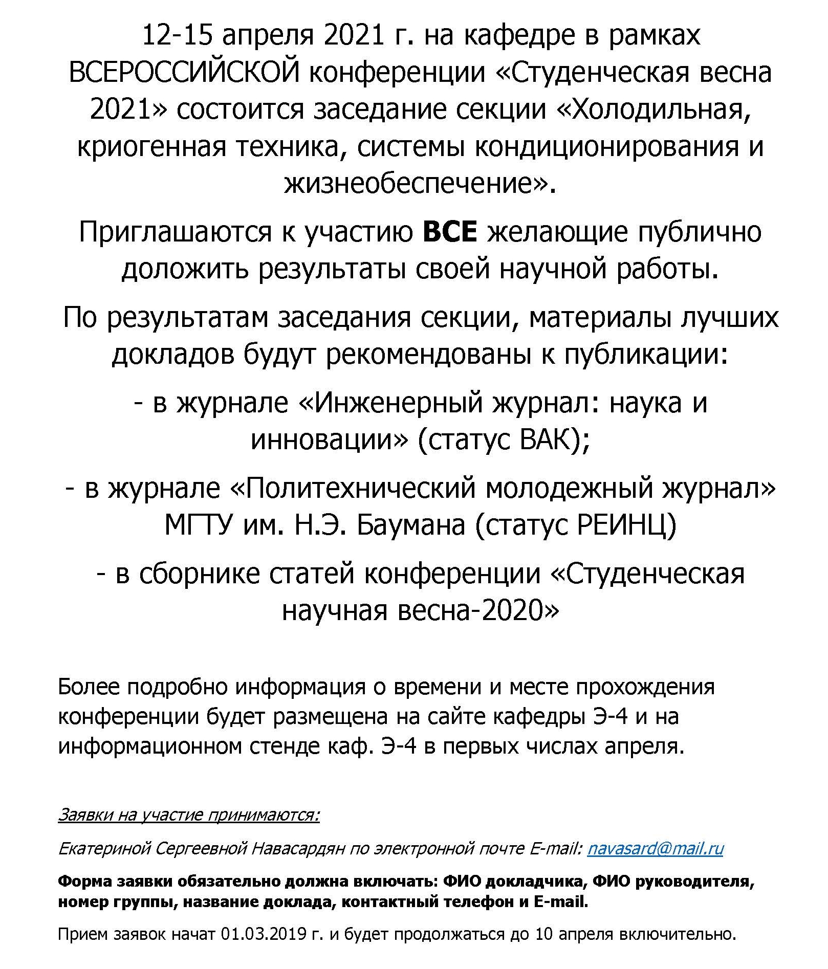 Кафедра Э4 — «Холодильная и криогенная техника, системы кондиционирования и жизнеобеспечения»